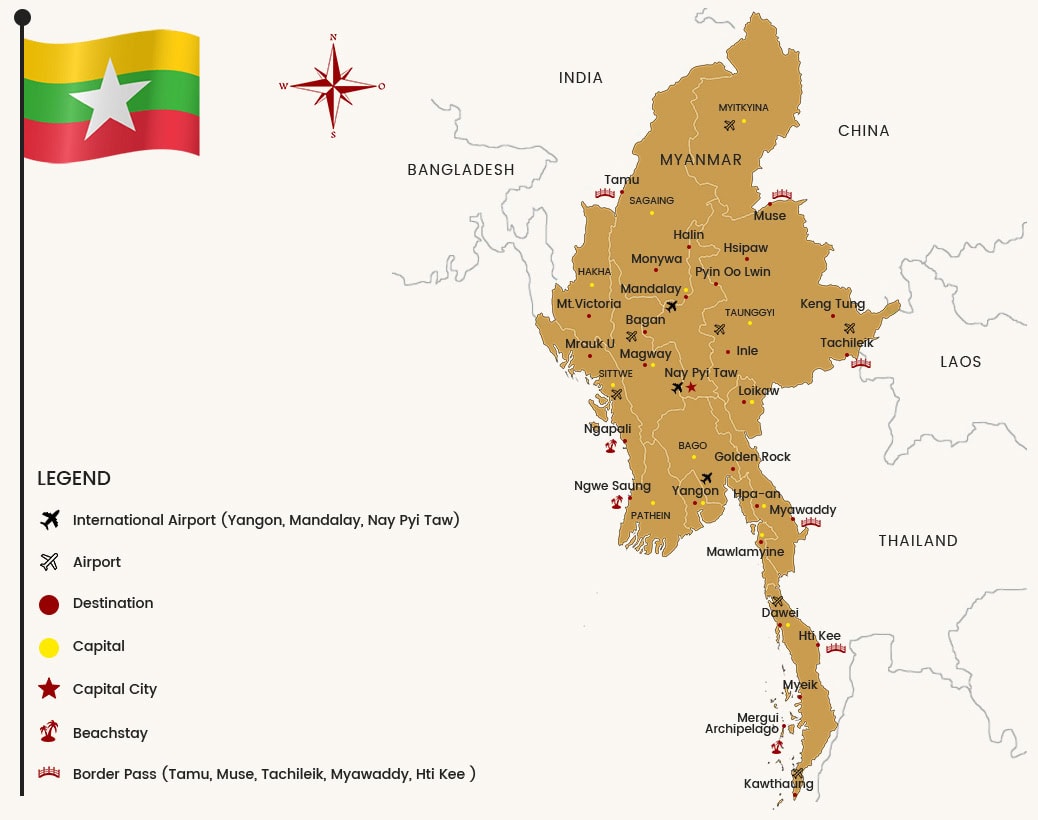 Le Myanmar (Birmanie) est le second pays en Asie du Sud-Est en termes de superficie et souvent appelé le Pays Doré. La Birmanie est célèbre pour son peuple amical et souriant, des paysages spectaculaires, une diversité culturelle et des sites archéologiques de classe mondiale, dont le site de Bagan, désigné Patrimoine Mondial de l’Humanité, terre de 135 ethnies distinctes, chacun de ces groupes ayant sa propre culture, langue, traditions et coutumes, certainement un des attraits importants de tout voyage au Myanmar. Le pays s’enorgueillit d’une Nature généreuse et variée, d’une population charmante et avenante, de pagodes étincelantes et d’une architecture sans pareil.