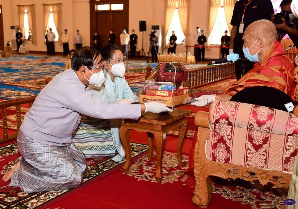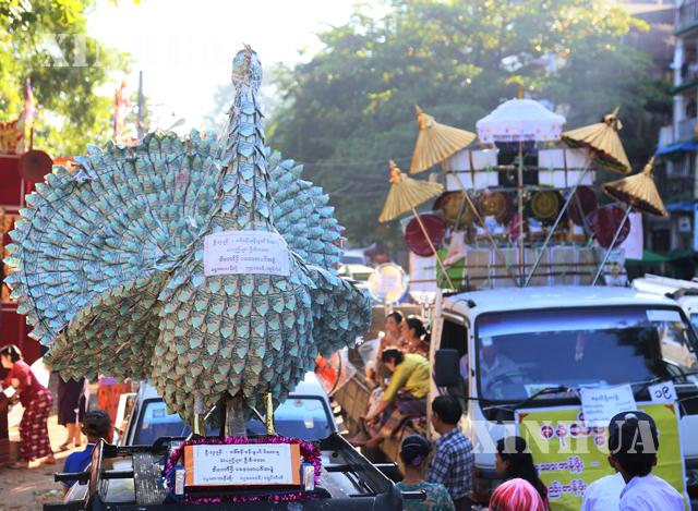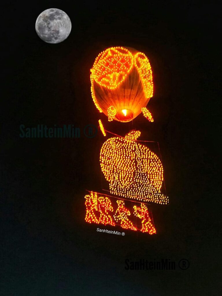 Another famous activity is celebrating ‘ Kahtein’, Buddhist ceremony in which people make all sorts of donations to monks as an expression of gratitude. The people living in the same ward or the people working in the same office or trade or compound or same profession collect the gifts for donation to monasteries. The people decorated these offerings : yellow robes and slippers, umbrellas, alms bowls, towels, cups, etc. on the wooden triangular or circle structures called ‘ padetha trees’. Anyone welcome to hang whatever they wish to contribute, a kyat note, or a handkerchief or a soap, no matter if it is small or a little. Some padetha trees are ornamented with new Myanmar currency notes folded into beautiful patterns such as triangles, circles or birds artistically. The people display these wooden structures called “padetha trees” at marketplace, bus-stops or every corner of the country so that everyone can contribute in cash or in kind. They also try to entertain to draw donors with songs, dances, giant puppets and speakers. On the full moon day of Tazaungdaing, people donate these padetha trees to their designated monastery. On the way to designated monasteries, the rows of these padetha trees put on the trishaws or cars can be seen and the people show them around town while playing cheerful music.